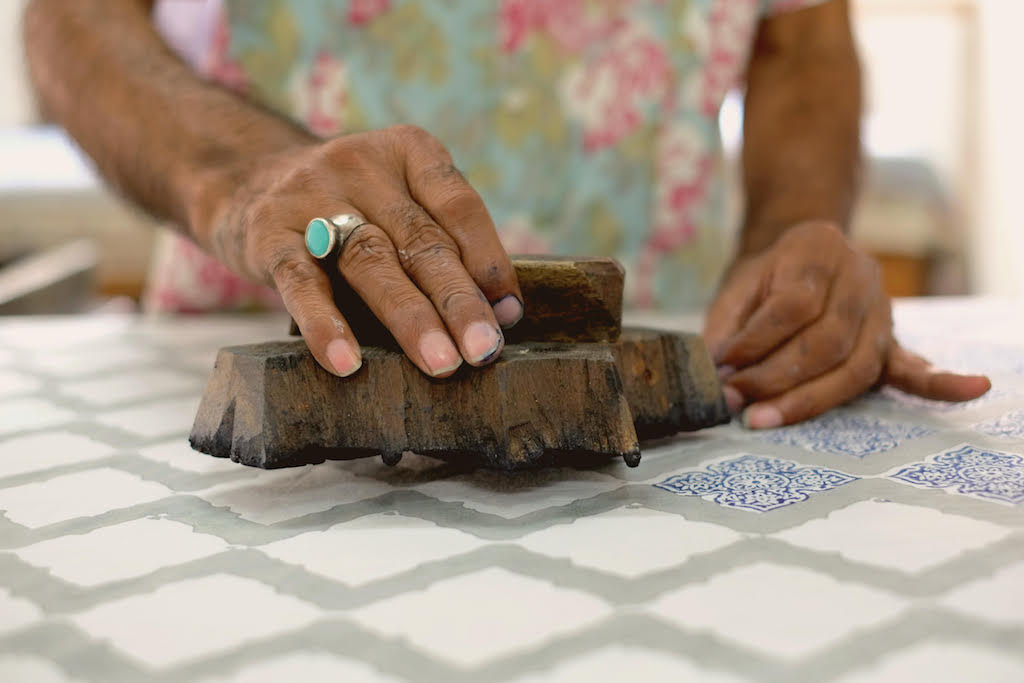 Dit product is met de hand bedrukt met behulp van de blokdruktechniek, waarbij de stof wordt bedrukt met houten stempels.